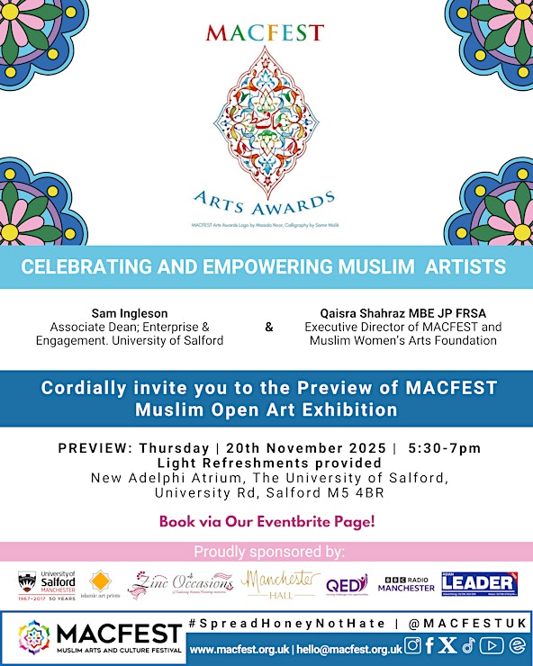 Prepare to visit the New Adelphi Gallery at the University of Salford on Thursday 20 November 2025, at 5:30pm for the opening preview of the MACFEST Muslim Arts Awards exhibition. The show will remain open through to early December, welcoming anyone eager to explore, connect and celebrate.